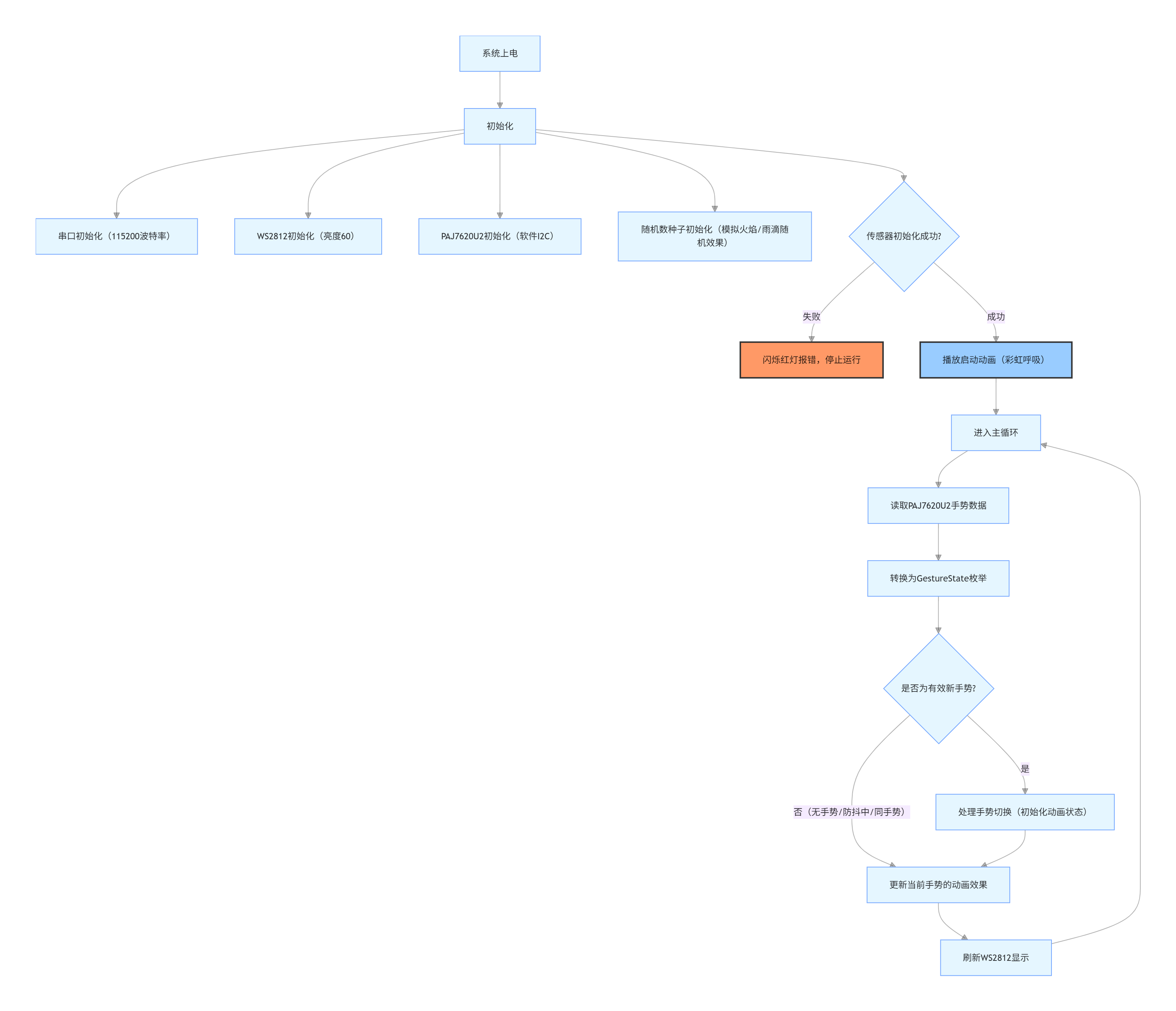 上电后,3 块矩阵先播放彩虹呼吸启动动画,随后进入待机状态,串口输出初始化日志;动画结束后,LED全部熄灭,等待手势输入