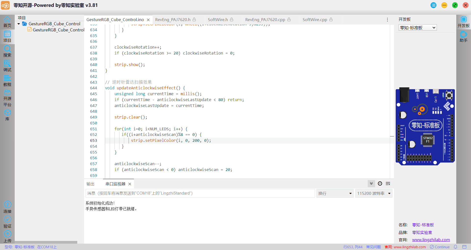本项目基于零知标准板(主控STM32F103RBT6) 、PAJ7620U2手势识别传感器 以及三块8x8 WS2812 RGB矩阵(共192个LED),打造了一个高度智能化的手势交互立方体系统。通过精确的手势识别技术,用户可以在空中做出9种不同手势(向左、向右、向上、向下、向前、向后、顺时针旋转、逆时针旋转、挥手),系统实时响应