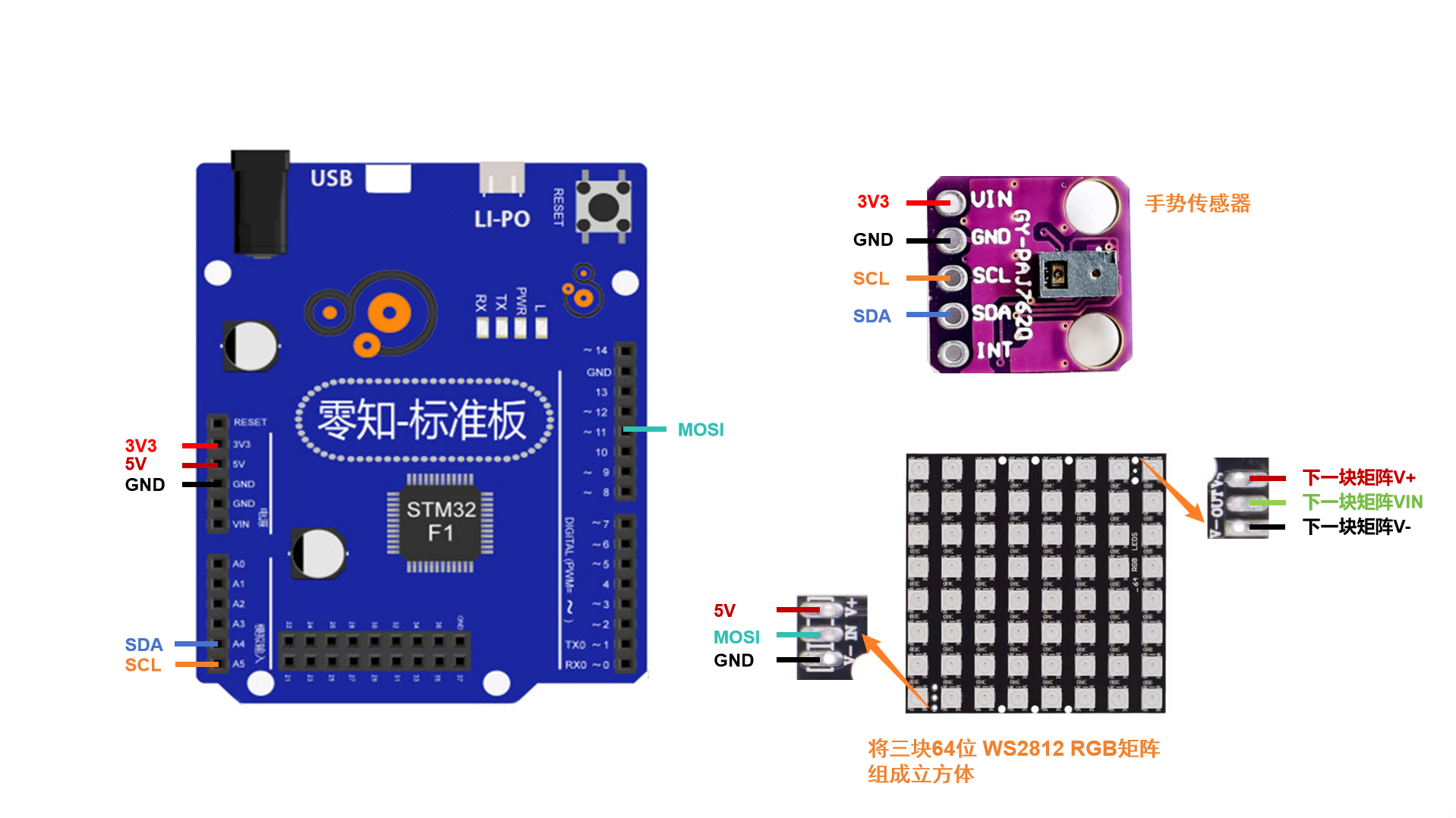 PAJ7620U2手势模块采用扩展板直插,主控、传感器必须共地,WS2812矩阵输入信号为SPI通信的MOSI引脚