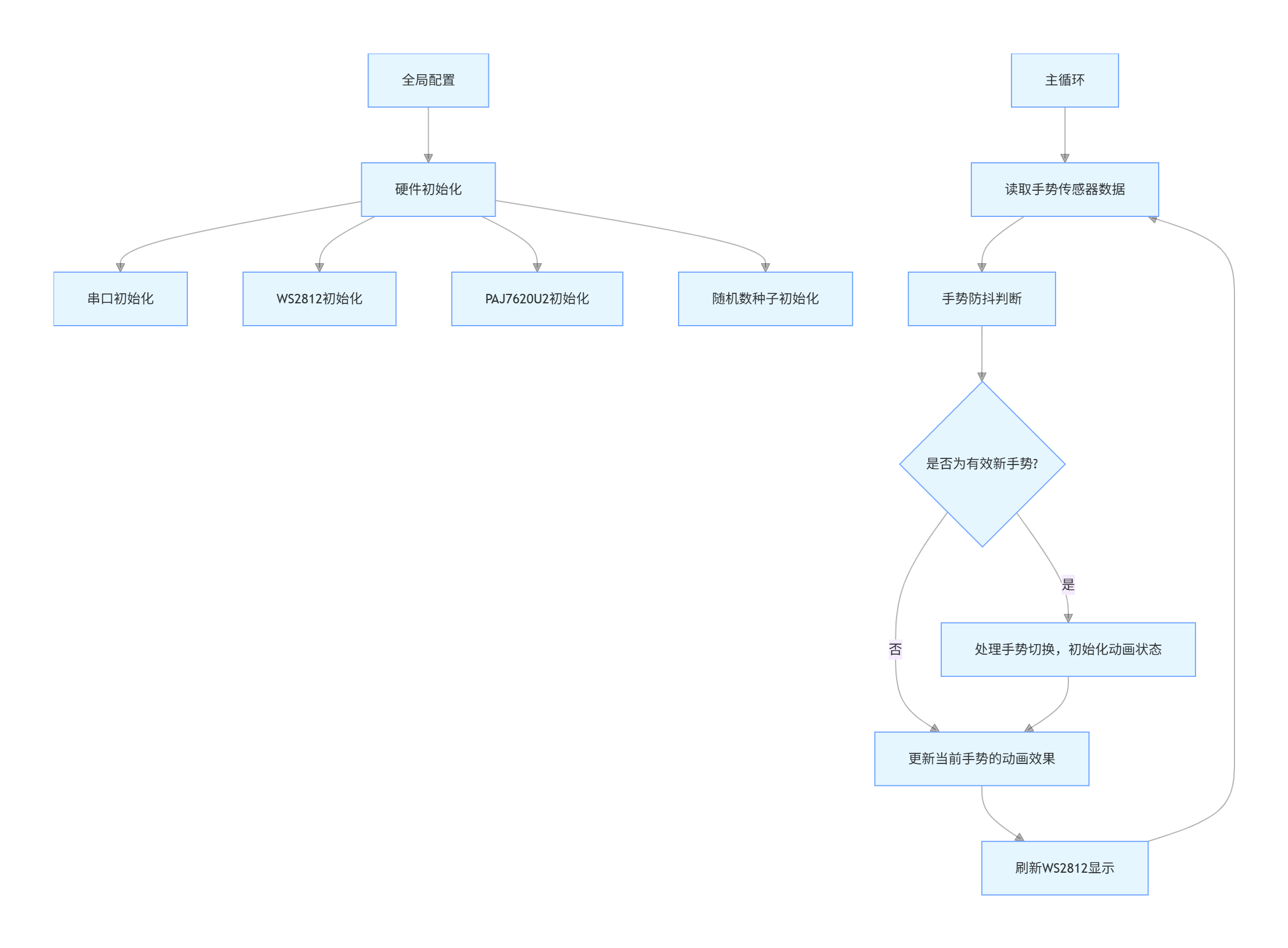 主控板通过 I2C 总线周期性读取 GESTURE_VALID_FLAG 寄存器,当检测到标志位为 1 时,读取 GESTURE_DATA 寄存器的手势编码,转换为对应的手势指令
