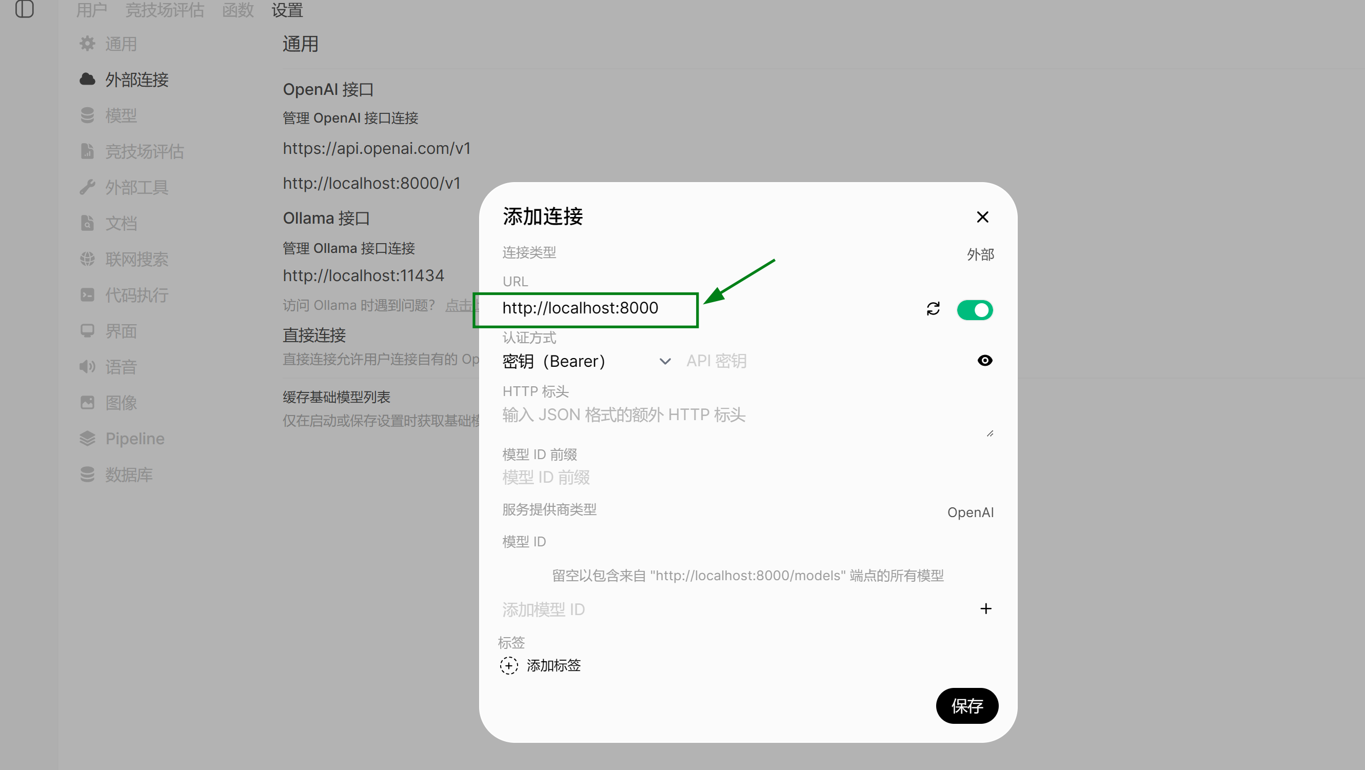 填入 http://localhost:8000 ,即 AutoDL 容器中开启的 vllm 服务 url ,保存。
