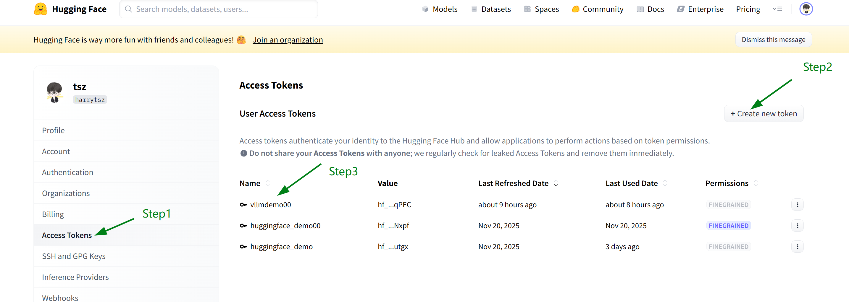 可以在 HuggingFace 官网的 Access Tokens 中创建一个新的 Token,对应的 Token 填入到 HF_TOKEN 中即可。