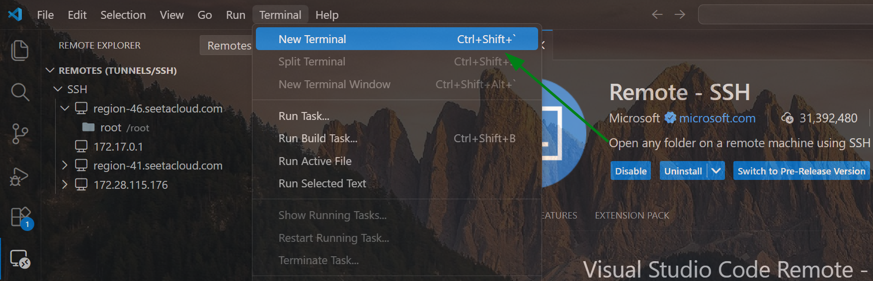 使用 VSCode 连接上 AutoDL 容器后,点击 VSCode 菜单栏中的 Terminal,创建新的命令行终端: