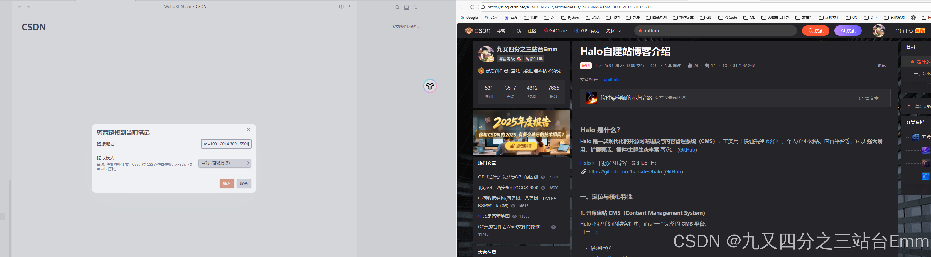 与普通"复制网页 → 粘贴 Markdown"的方式不同,本插件提供了一个 可视化正文选择器(Web Picker) ,允许用户直接在网页中用鼠标选中真正的正文区域,并自动生成 CSS 路径 / XPath 路径,再将该区域内容转换为 Markdown 插入到当前笔记中。