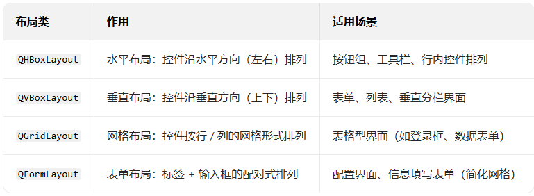 Qt 提供了 4 种核心布局类,覆盖绝大多数界面布局场景: