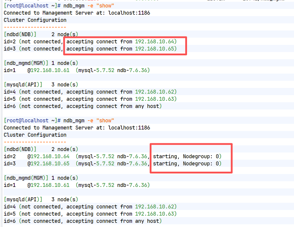 测试读写分离(或轮询): 由于 NDB 集群是全节点写入 (所有 SQL 节点都可以读写),HAProxy 采用 roundrobin 策略会将请求均匀分发到 62 和 63。