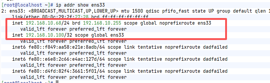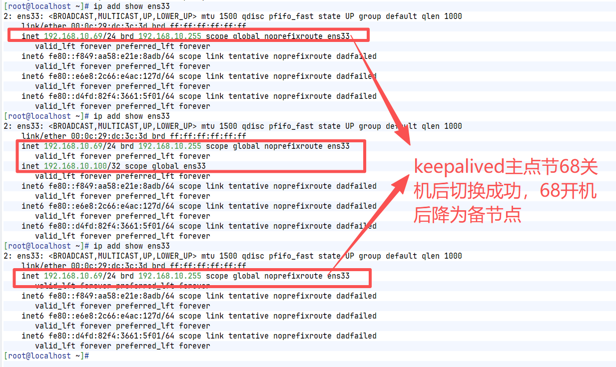 在 LinuxA (192.168.10.68) 上执行 ip addr show ens33,能获取到VIP说明已是主节点