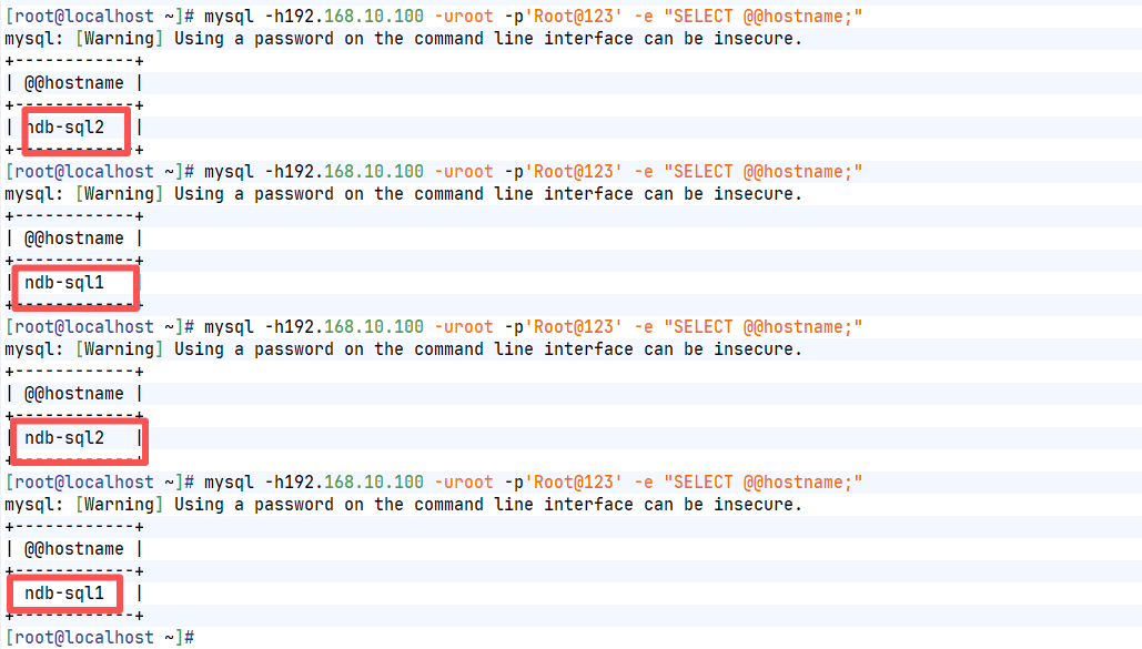 mysql -h192.168.10.100 -uroot -p'Root@123' -e "SELECT @@hostname;"