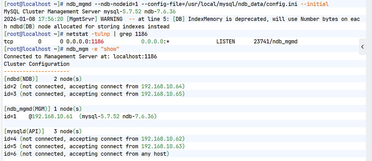 ndb_mgmd --ndb-nodeid=1 --config-file=/usr/local/mysql/ndb_data/config.ini