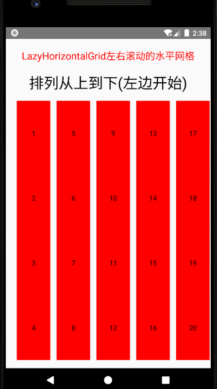 Text(text = "LazyHorizontalGrid左右滚动的水平网格", fontSize = 20.sp, color = Color.Red)