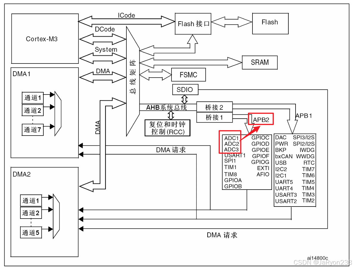根据STM32总线架构图可知,ADC123均挂载在APB2总线上,因此时钟频率默认最高为72MHz。