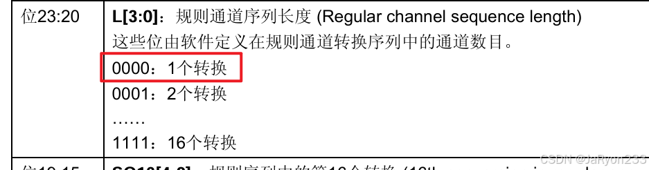 本次仅通道10进行转换,因此规则通道组序列长度为1,即前面介绍寄存器所说的L[3:0]配置为0000即可;