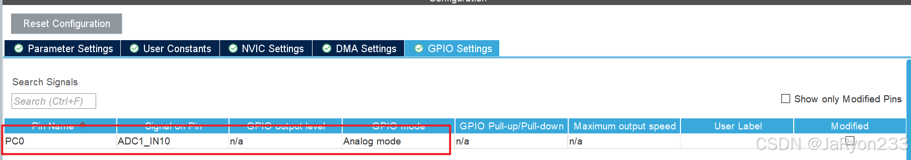 其余内容就按照寄存器方式配置统一即可,配置ADC1的通道10后,PC0端口其实直接自动配置好了,如下图所示。