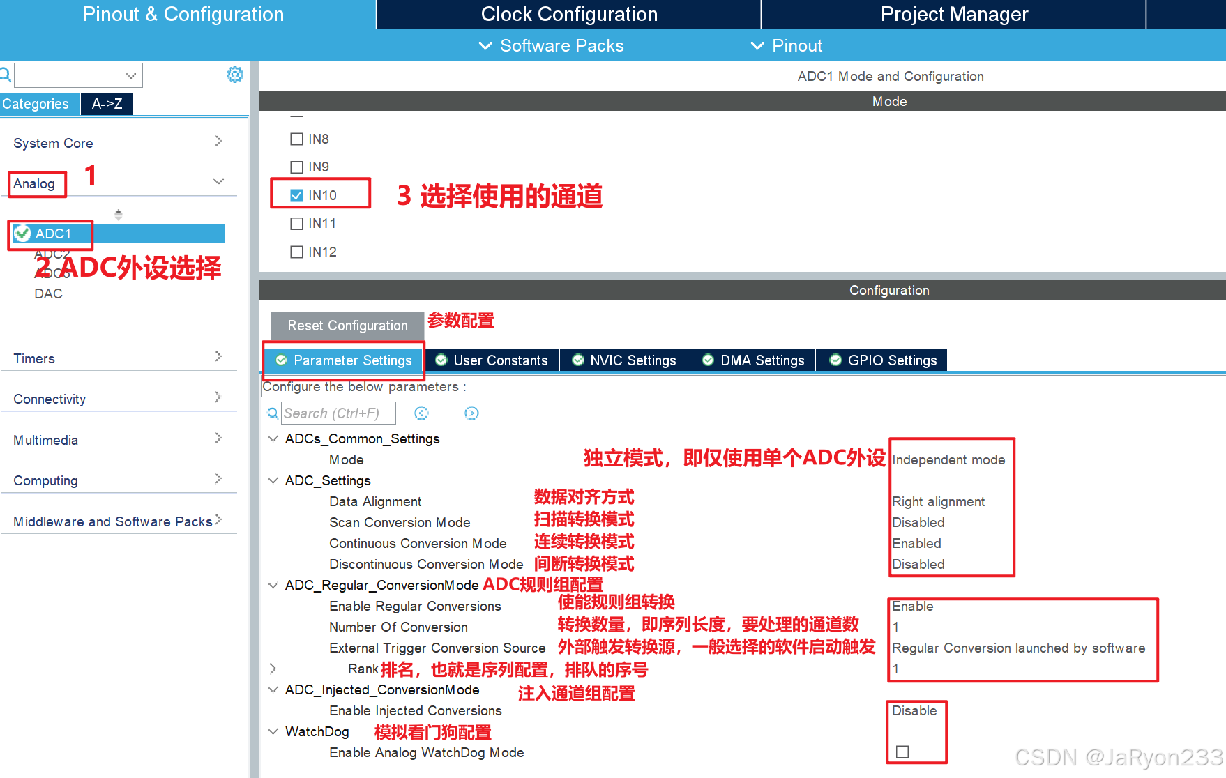 然后是ADC的参数配置部分,这里主要在Analog中,选择ADC1,然后选择使用的通道10,即IN10。然后配置其中的参数,如下图所示。