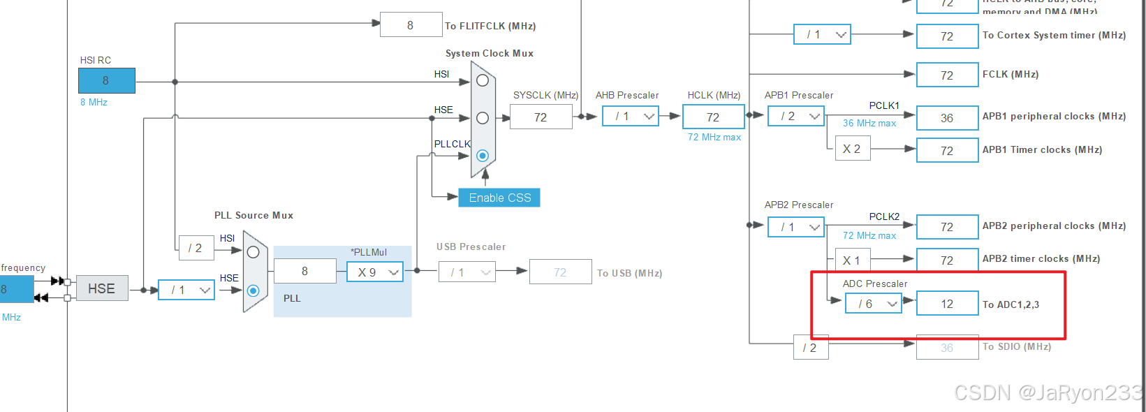 首先是关于时钟的配置,因为ADC对时钟频率有要求,因此除了基本的时钟树配置,还需要对连接ADC外设的时钟分频器进行设置,比如与之前寄存器实现时一样设置为6分频。