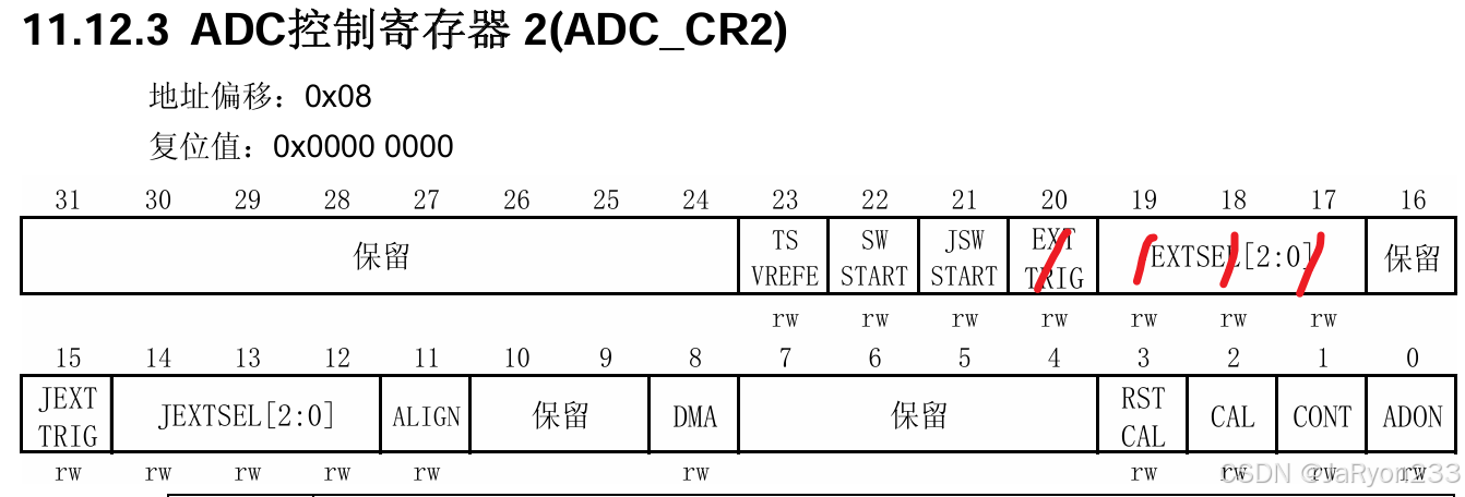 简单来看,ADC初始化的部分就这样就可以直接开始准备转换了,但是考虑后未来可能常见多通道转换,涉及到注入和规则同时存在,因此最好再配置一个触发方式,用于启动转换。也就是使用SWSTART配置来启动ADC规则组通道的转换。