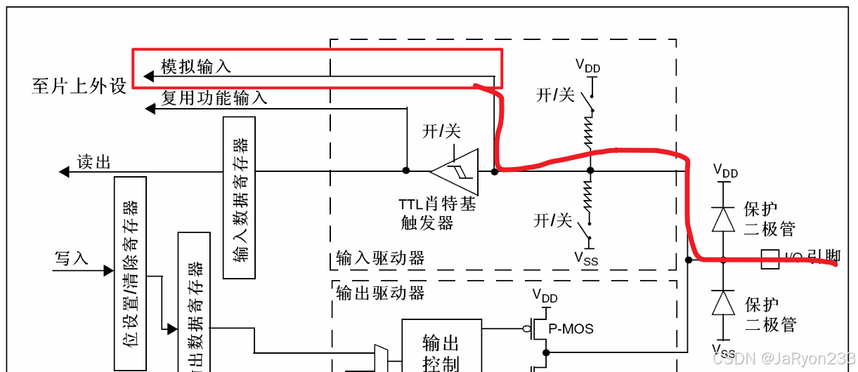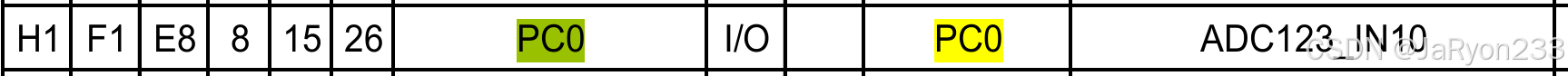 接着,模拟电压通过PC0进入通道,那么PC0这个所谓的GPIO引脚就需要进行配置,本身既然动用的GPIO也应该开启GPIO时钟,但是考虑到实际使用的是其模拟输入模式,整个走向并未进入TTL肖特基触发器就直接给到片上外设,因此实际GPIO无需配置时钟。