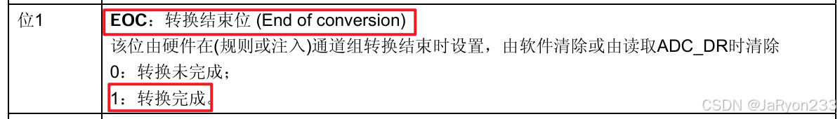 最后就是等待转换完成,这里涉及到ADC的状态标志,因此相关位在ADC状态寄存器中配置。