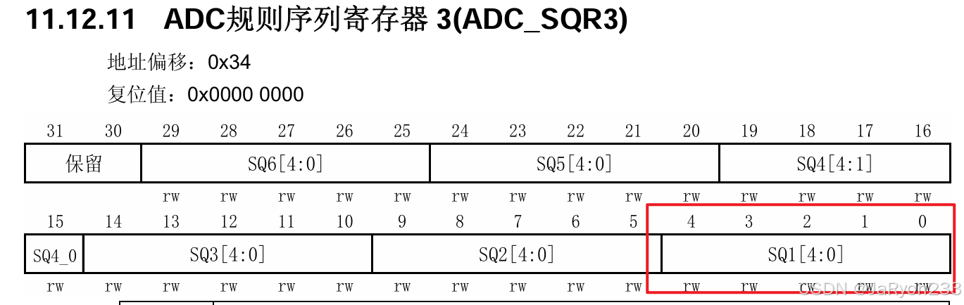 既然只有一个通道,那就默认将通道10排队在序号1呗,也就是设置序列SQ1为10即可,对应的就是SQL3寄存器的低5位给10(二进制01010)了。