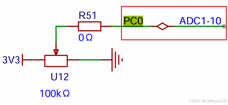 硬件上,通过可变电阻配合 3V3 电源,让 PC0 引脚能输出可变电压,给 ADC 提供不同的采样输入。