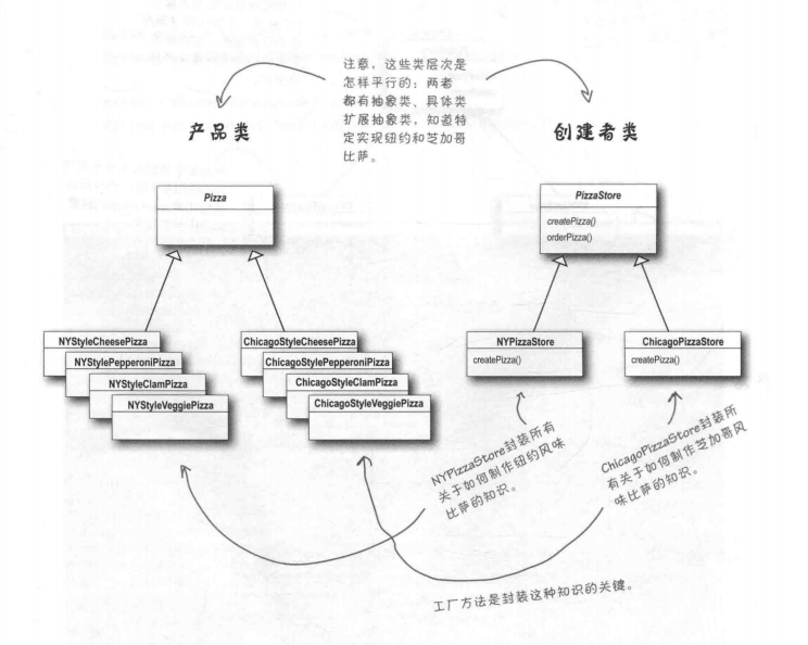 对于每一个具体创建者,通常有一整套产品要创建。芝加哥披萨创建者创建不同类型的芝加哥风味披萨,纽约披萨创建者创建不同类型的纽约风味披萨等。事实上,我们可以看到创建者类及其相应的产品类集平行的层次。