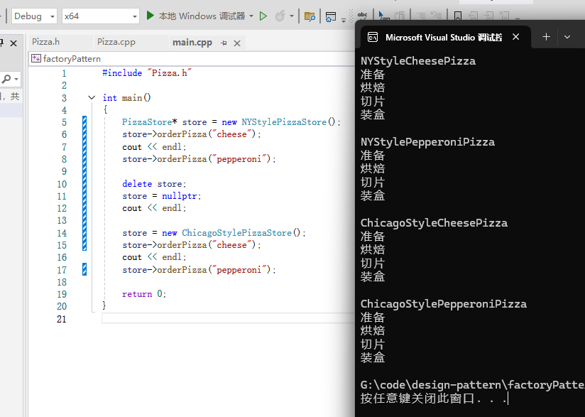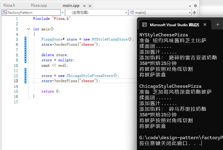 这里我们创建做纽约风味披萨的工厂。然后我们创建一个PizzaStore,并给它传递一个纽约工厂的引用。当我们制作披萨时,得到了纽约风味的披萨。芝加哥披萨店也类似。