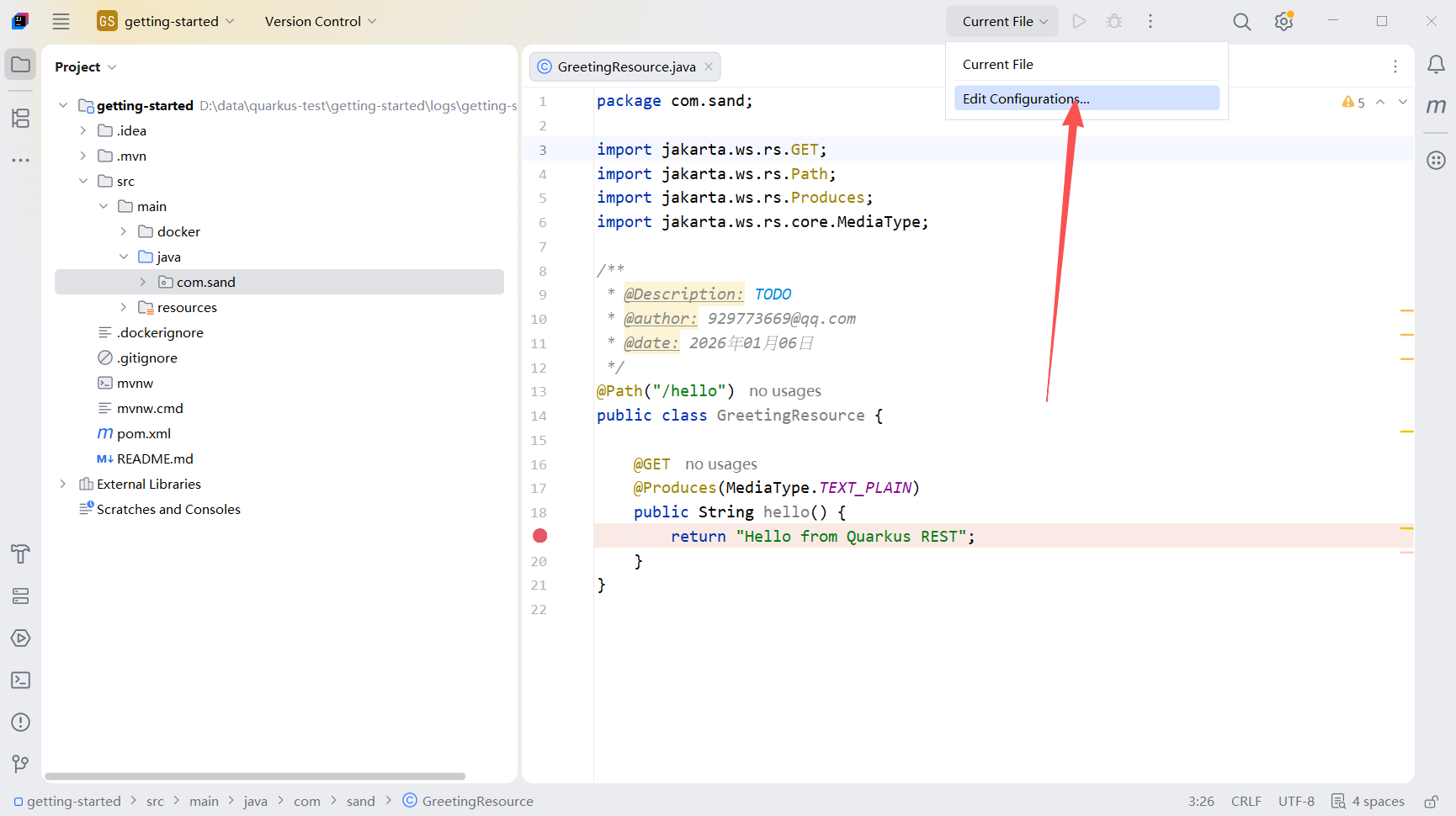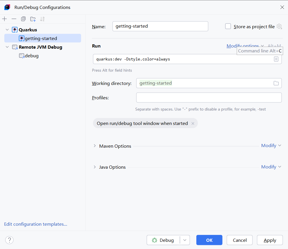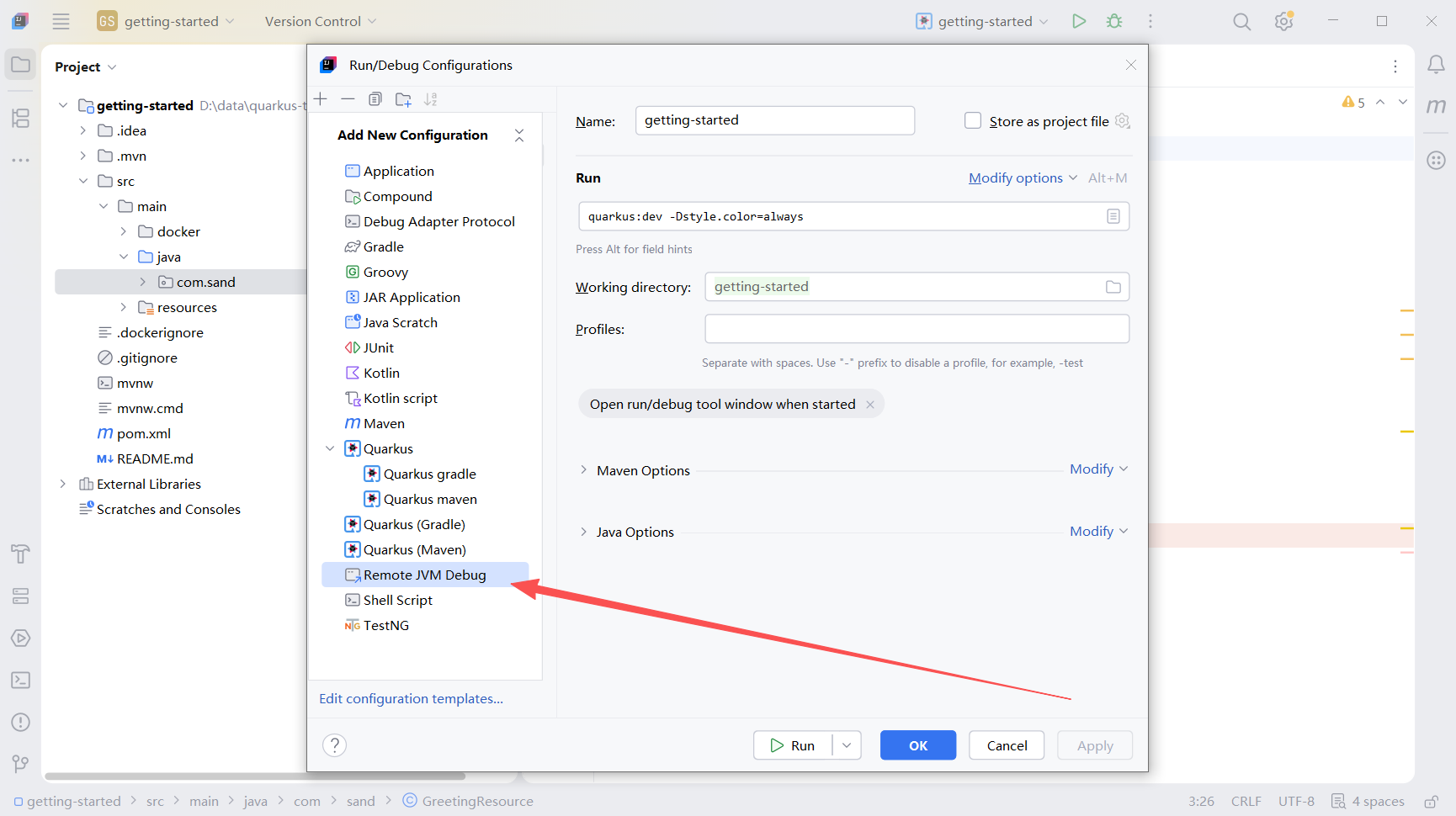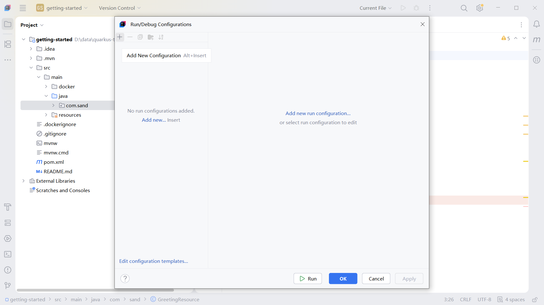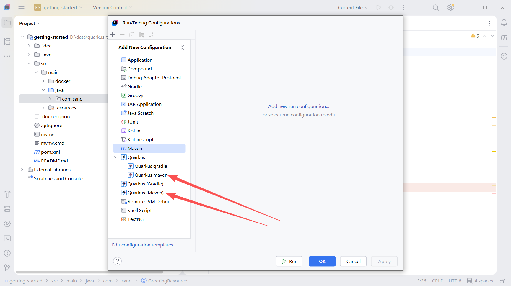 Quarkus默认端口为5005,接下来进行配置,还是打开configurations菜单