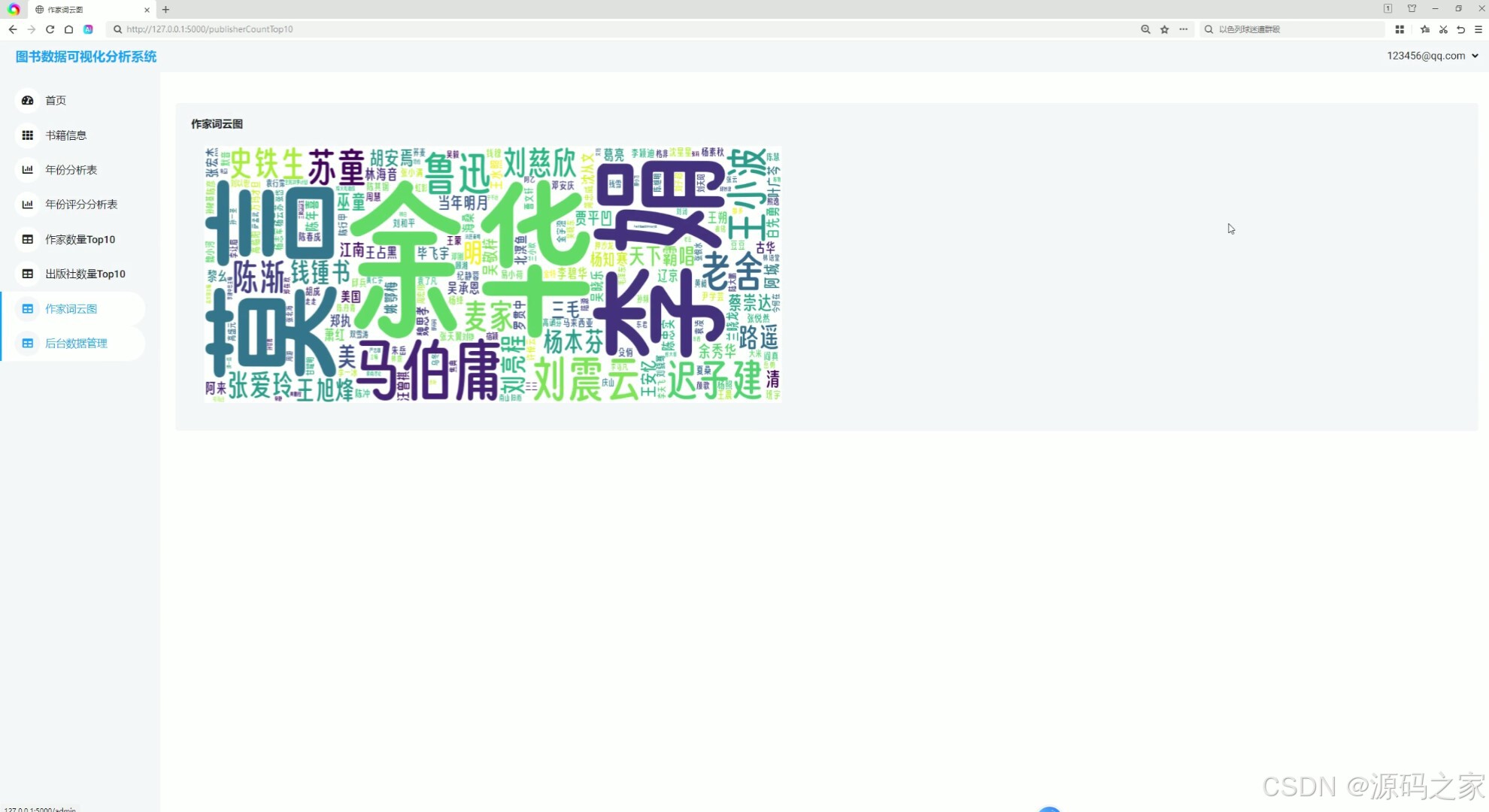 词云图是一种直观展示文本数据中关键词频率的可视化方式。在这个模块中,通过词云图展示系统中出现频率最高的作者名字。字体越大,表示该作者的作品数量越多或影响力越大。这种可视化方式可以让用户快速了解系统中最受欢迎或最活跃的作者群体。