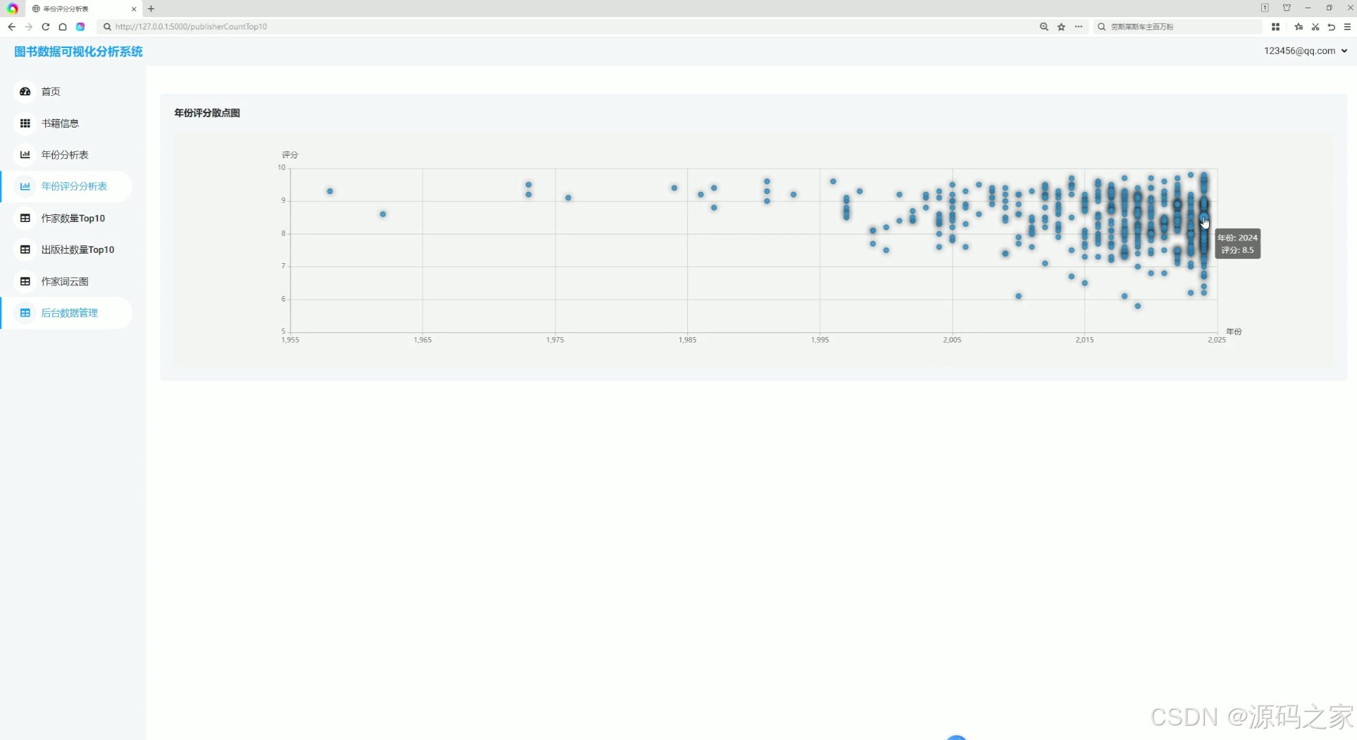 该模块通过散点图的形式,将图书的出版年份与评分进行关联展示。每个点代表一本图书,横轴为出版年份,纵轴为评分。用户可以通过这种可视化方式,快速发现不同年份图书评分的分布规律,例如某些年份的图书是否普遍评分较高。