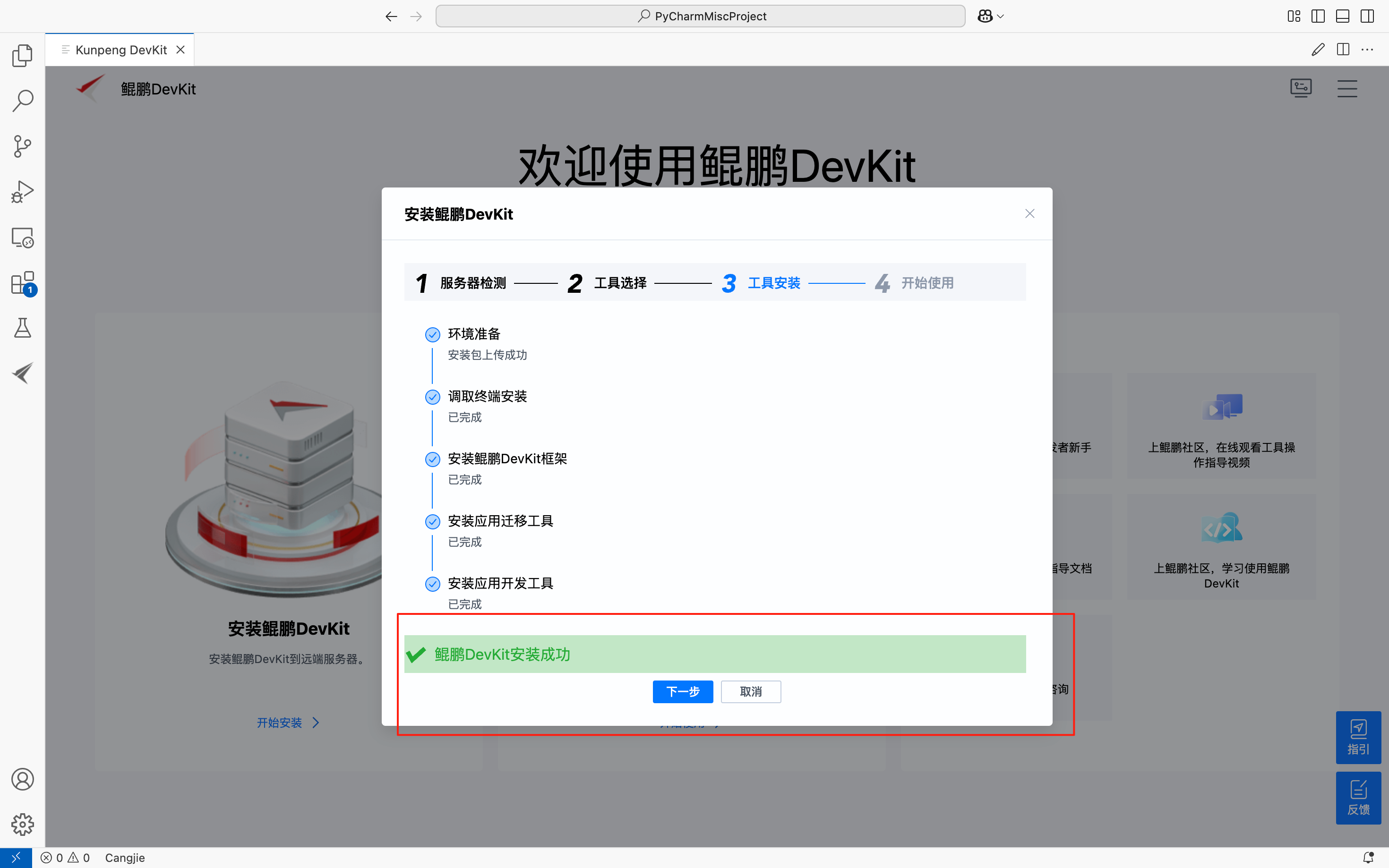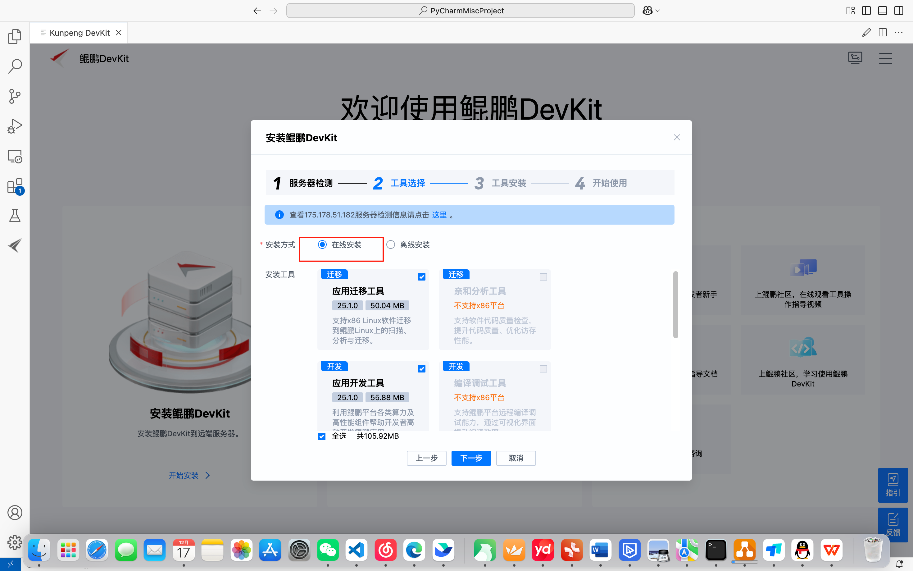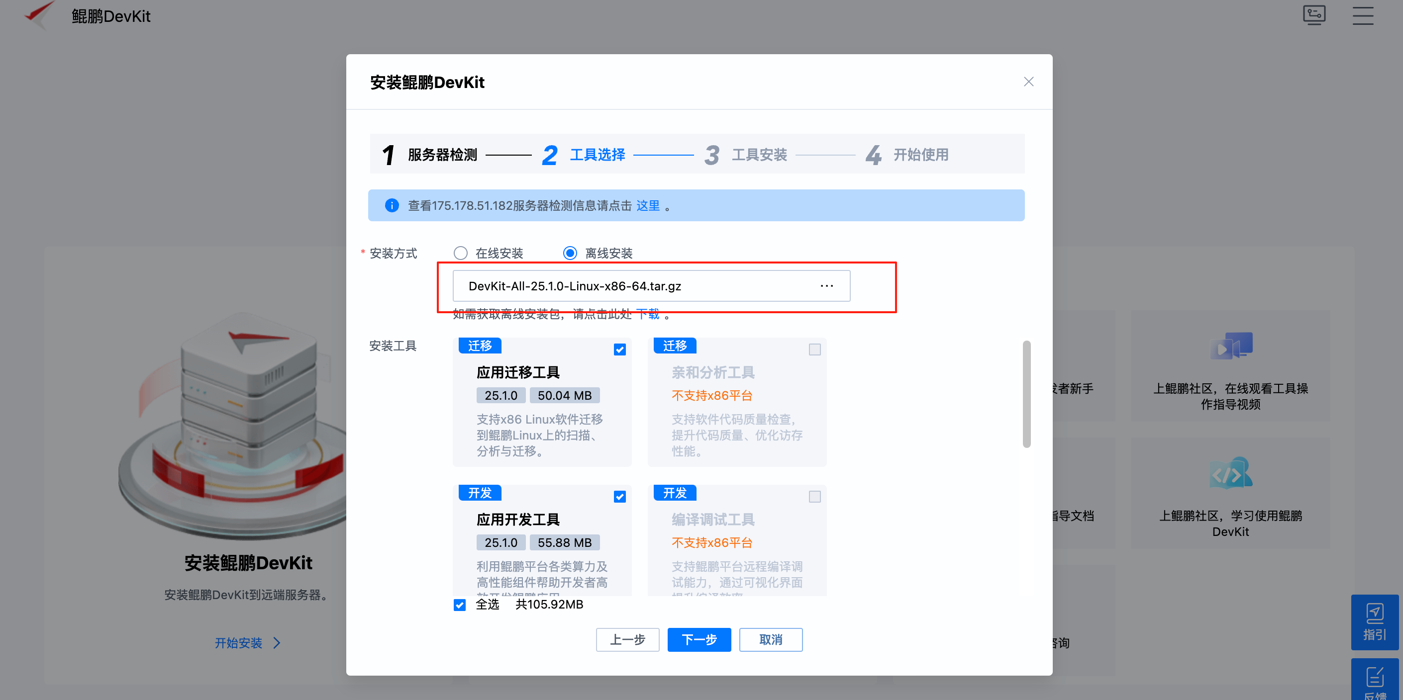 - 在线安装:远程服务器与外部网络连接,在线自动获取弹性框架和已选择的工具软件包并完成安装。