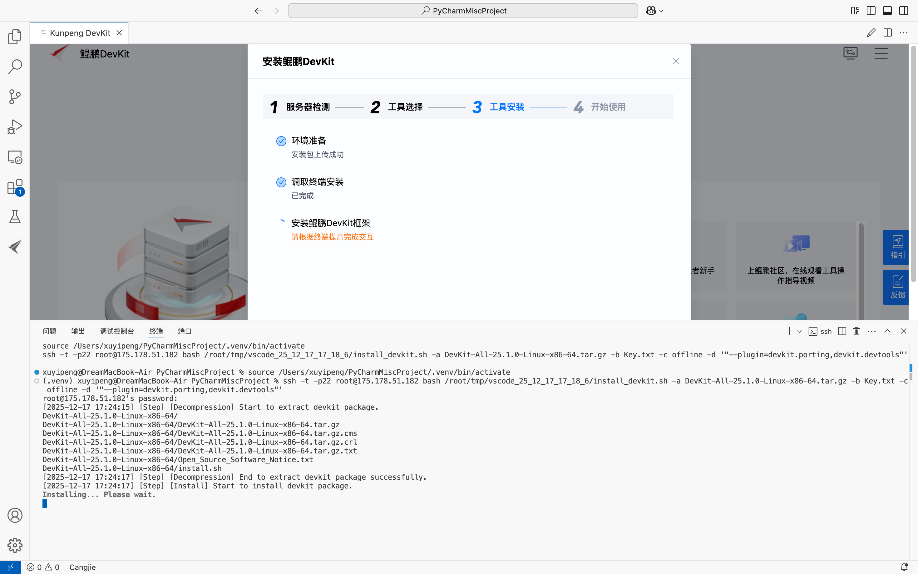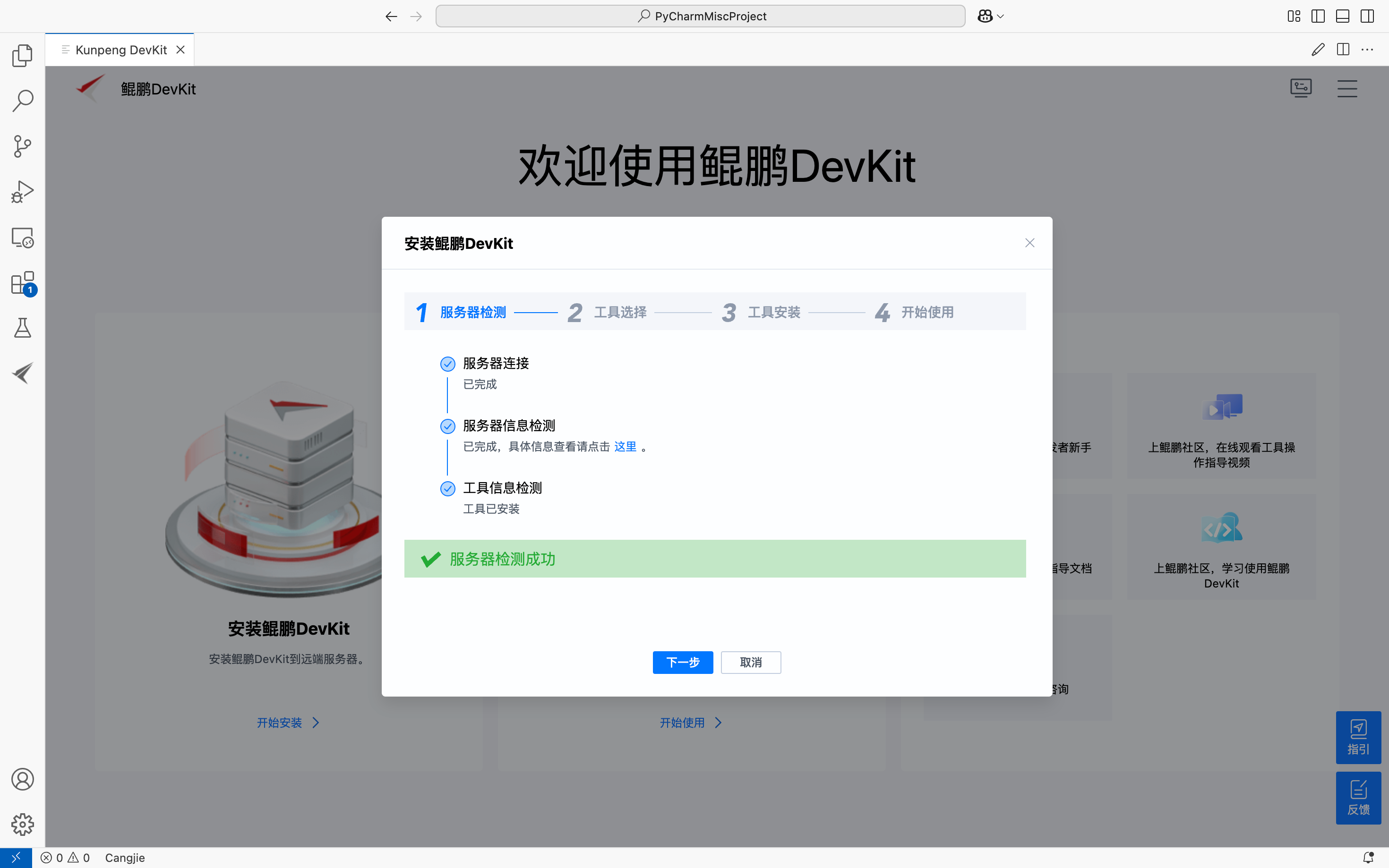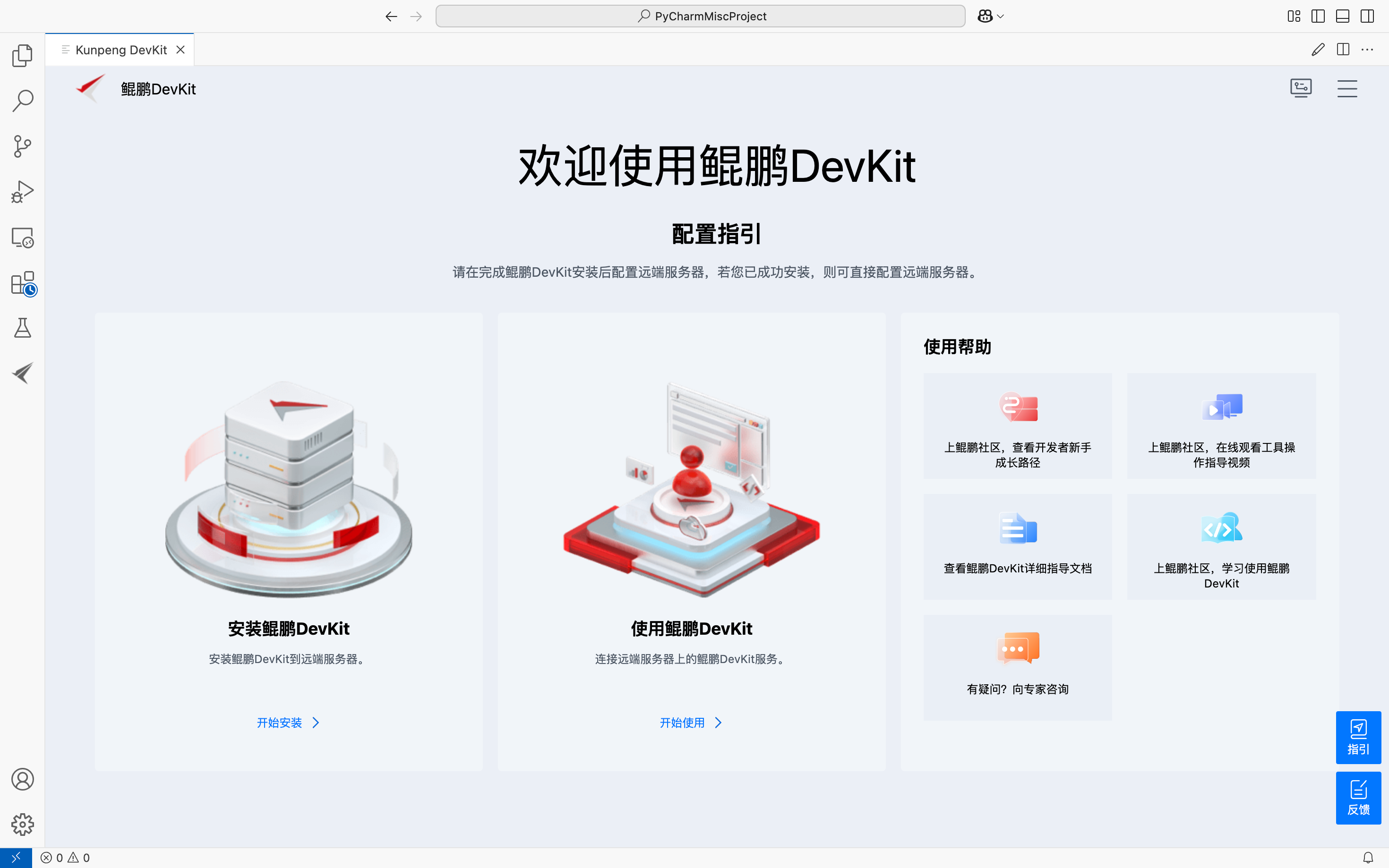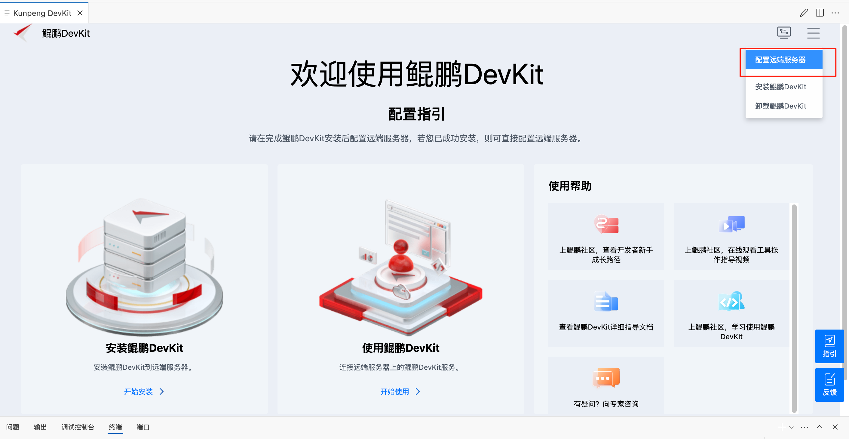 具部署完成后,单击右上角,在下拉菜单中选择"配置远端服务器"可切换到其他已经部署了鲲鹏DevKit的服务器: