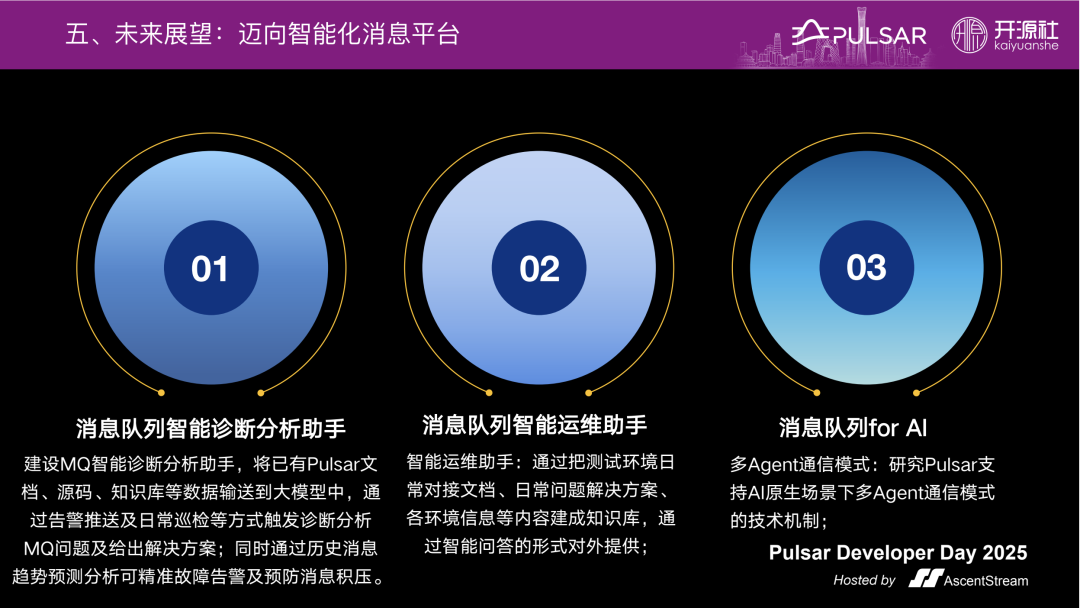 正在探索 Pulsar 对多 Agent(智能体)通信模式的支持能力。银行内部的 AI 应用场景,如智能客服、风控模型协同等,未来可能需要高效、可靠的多 Agent 通信基础设施。这一方向也参考了行业领先云厂商提出的 AI 原生消息队列技术路线。
