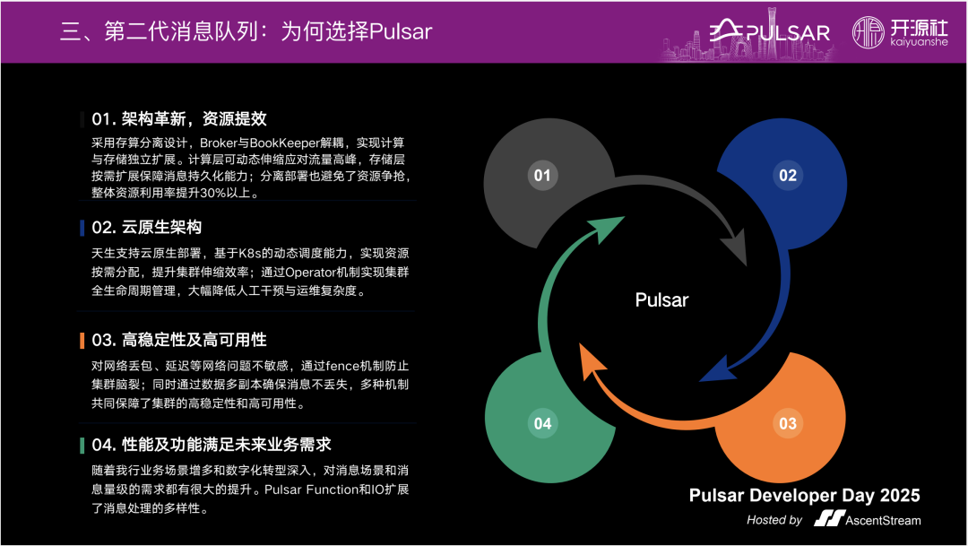 第二代消息队列的核心目标是实现架构革新及资源提效 。Pulsar 的架构采用了存算分离的设计,将 Broker 与 BookKeeper 解耦,使得计算层与存储层能够独立扩展。这带来了动态伸缩的能力 :计算层可以灵活应对突发的流量高峰,而存储层则能按需扩展以确保消息的持久化能力。这一架构变化与行内已有的 Redis 等组件形成了资源互补,整体资源利用率提升了 30% 以上。