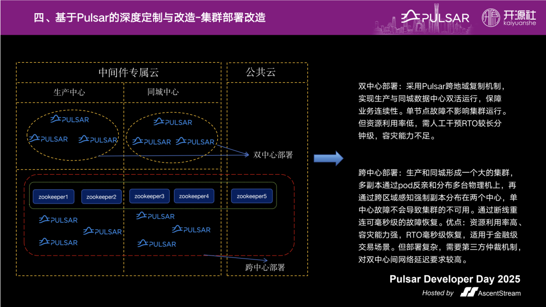 关于多中心部署的实际效果,部署模式是生产中心与同城中心形成双活架构,依赖 Pulsar 跨地域复制保障数据最终一致。该架构下,单节点故障不影响集群整体服务,通过健康检查可实现秒级故障切换,客户端断线重连可达毫秒级恢复。以郑州实际部署为例,东西两个数据中心相距约 40 公里,通过高质量专用网络,将延迟严格控制在 1-2 毫秒内,满足了金融业务对实时性的苛刻要求。