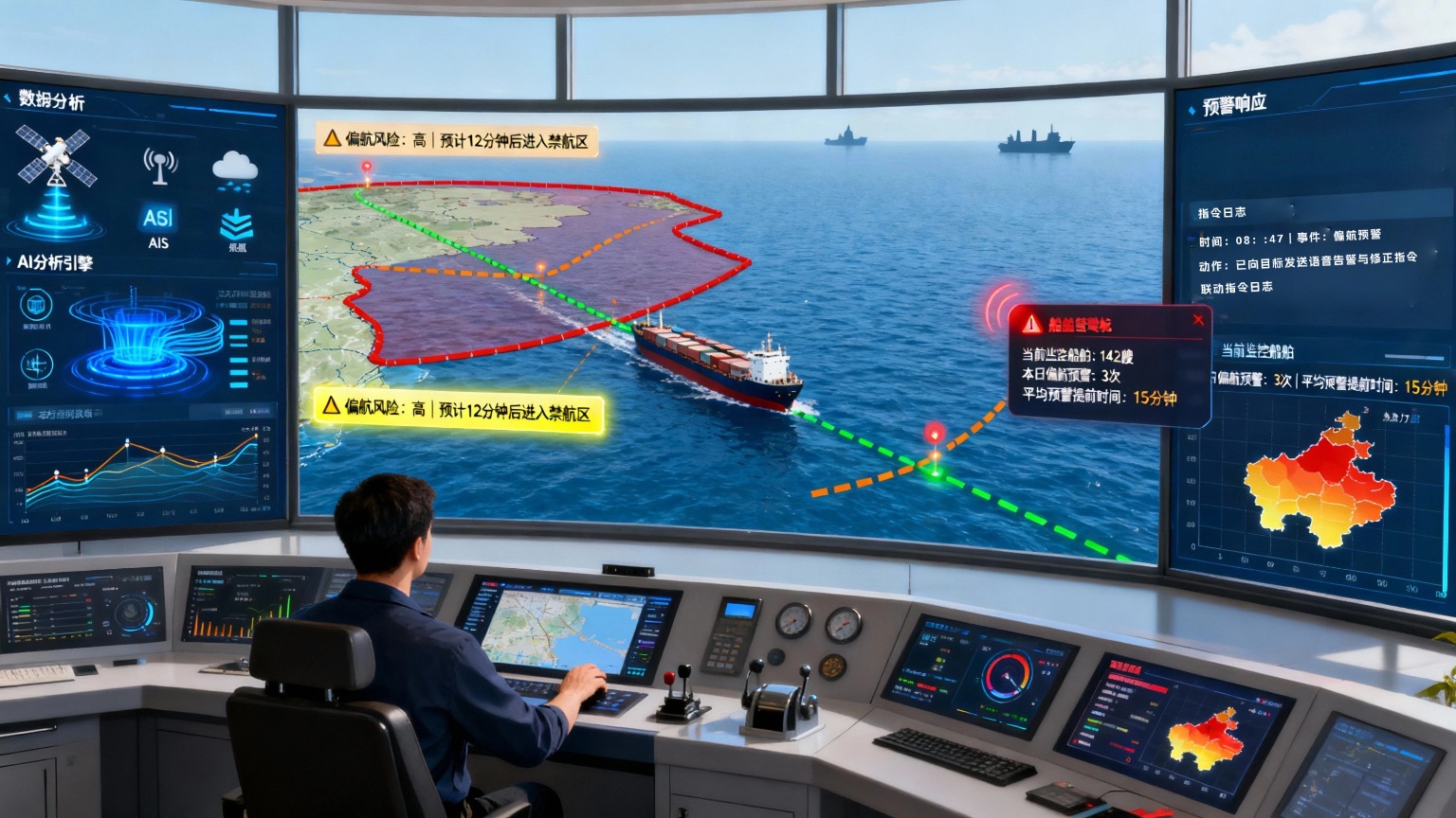 AI系统可以实现实时数据处理,能够迅速识别出船舶的偏航行为,并及时作出反应。相较于传统的人力监控,AI的响应速度和准确性大大提升。