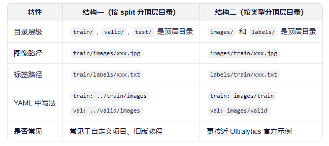 - 结构一:图像在 train/images/001.jpg → 标签必须在 train/labels/001.txt