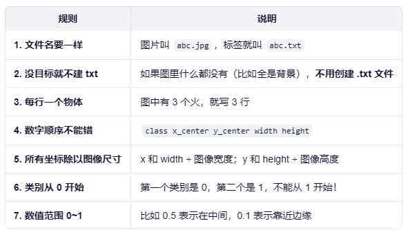 "类别编号 中心x 中心y 宽度 高度",所有数字都要变成 0 到 1 之间的小数(框坐标必须在 归一化 xywh 格式从 0 到 1)。