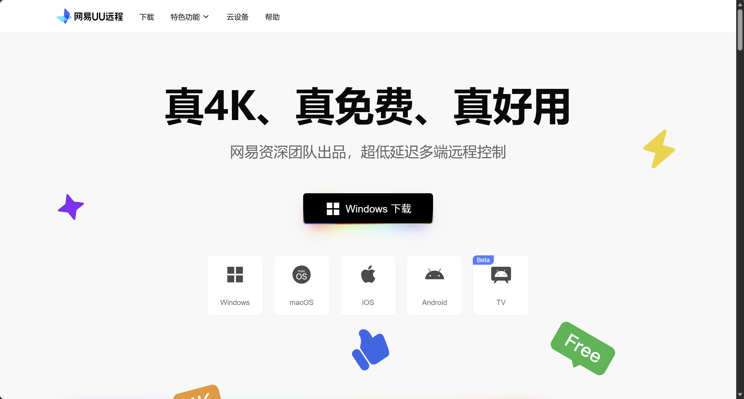 UU远程并非仅面向游戏玩家的"偏科工具",而是基于网易底层技术实力打造的一款兼顾高性能与实用性的全能远程控制软件。以"真4K、真免费、真好用"为核心特点,实现了从娱乐到办公的全面覆盖------既能流畅运行《赛博朋克2077》,也能安静高效地完成每一行代码编写。