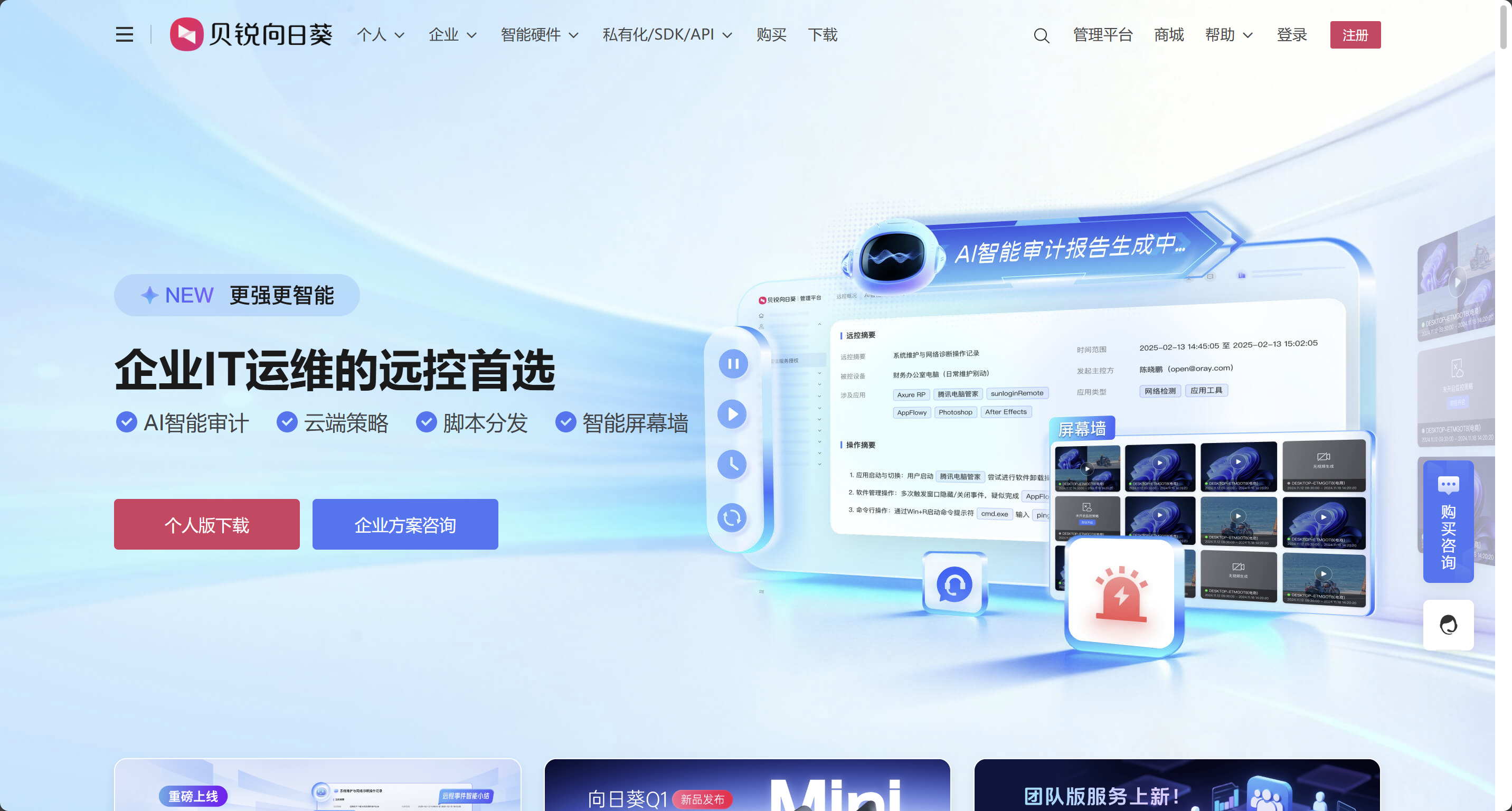 作为国内最早一批深耕远控领域的厂商,向日葵功能极其丰富,生态也最为完善。它拥有硬件生态闭环(如开机插座、开机棒等),支持全平台覆盖(Windows、Mac、Linux、Android、iOS),并且有企业级功能(批量部署、屏幕墙监控、IT运维审计)。
