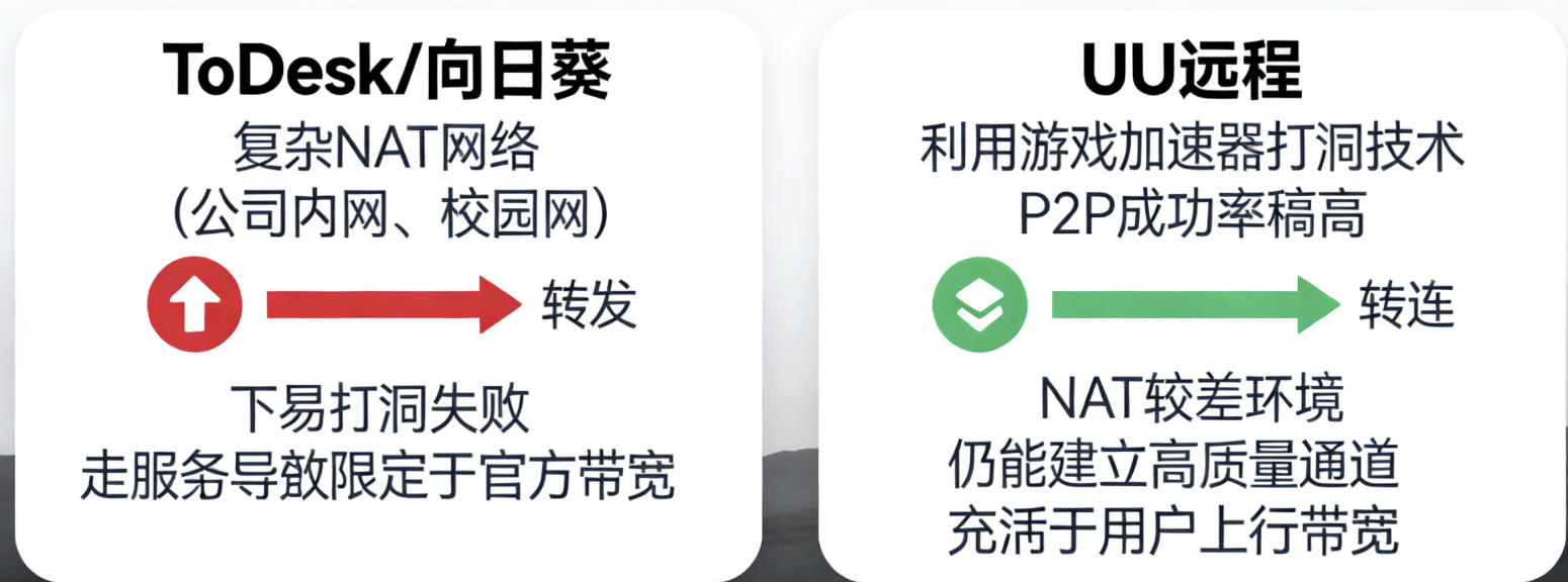 - UU远程:利用了游戏加速器的打洞技术,P2P成功率极高。即使在NAT类型较差的环境下,也能建立高质量通道,充分利用用户自身的上行带宽。