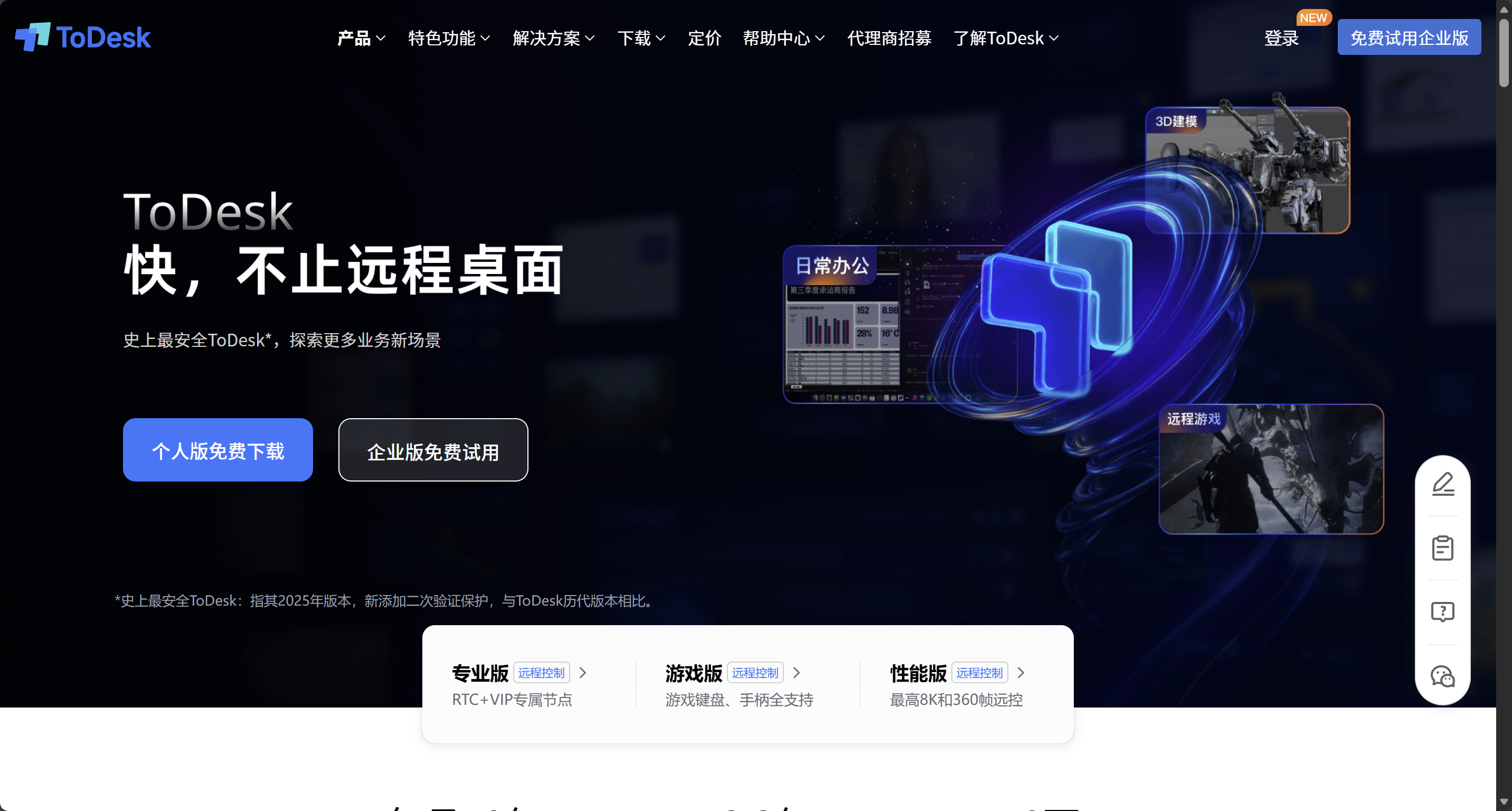 ToDesk早期凭"免费、不限速"迅速抢占市场,主打SD-WAN技术。它支持文件传输、隐私屏、远程打印等常用办公功能,界面相对简洁。