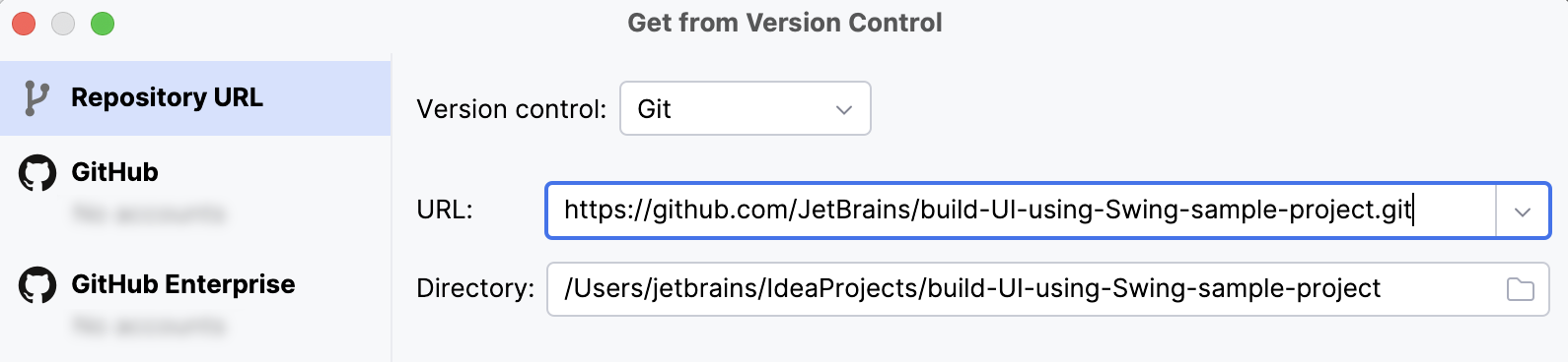 指定存储库的 URL,然后单击 克隆。