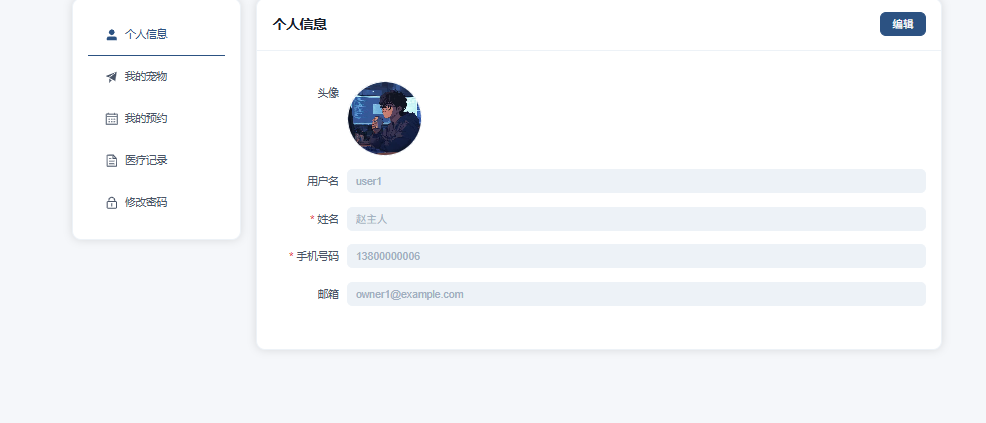 宠物主人登录后可以访问个人中心,管理个人相关的所有信息。个人中心包含以下功能模块:个人信息管理,可以查看和修改个人资料、修改密码、上传头像;我的宠物,可以查看、添加、编辑自己的宠物信息;我的预约,可以查看预约列表、创建新预约、取消待确认的预约;就诊记录,可以查看宠物的历史就诊病历,了解诊断结果和治疗方案。个人中心采用左侧菜单、右侧内容的布局方式,操作便捷直观。