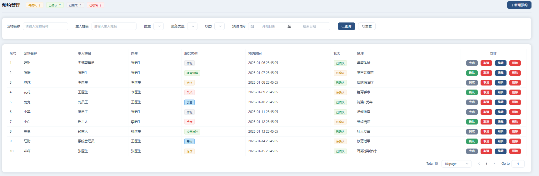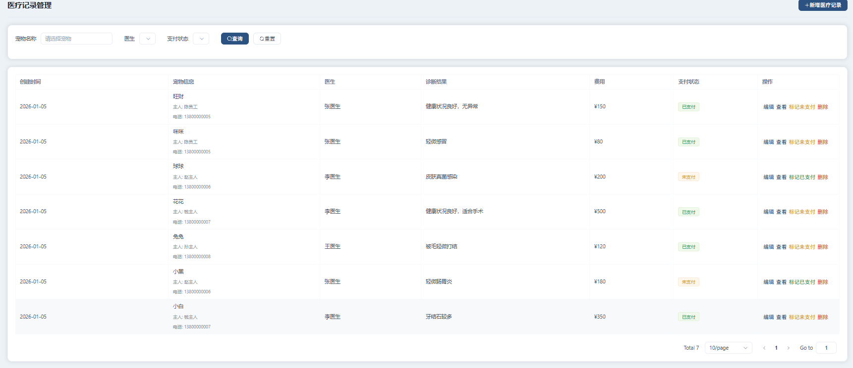 多角色权限控制:支持管理员、医生、员工、宠物主人四种角色,实现了细粒度的权限控制。