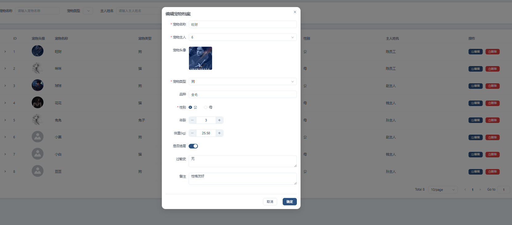 宠物管理功能测试覆盖宠物的增删改查操作,验证数据的正确存储和展示。