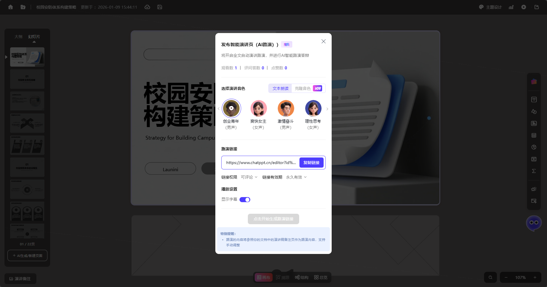 发布为智能演讲页(AI 路演):将 PPT 发布为智能演讲页面。