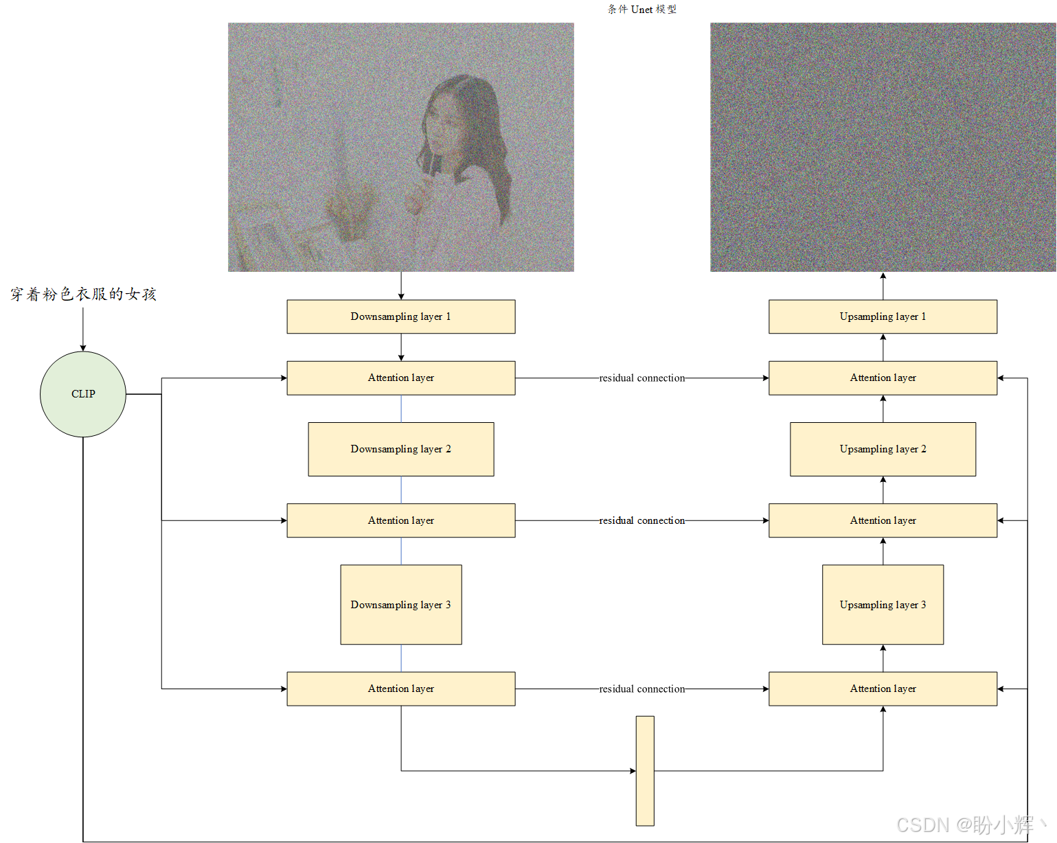 在标准 UNet 架构中,模型通过下采样卷积层与上采样卷积层构成编解码结构,并配备跨层残差连接。而在条件 UNet 中,我们会在现有卷积层之间插入注意力层: