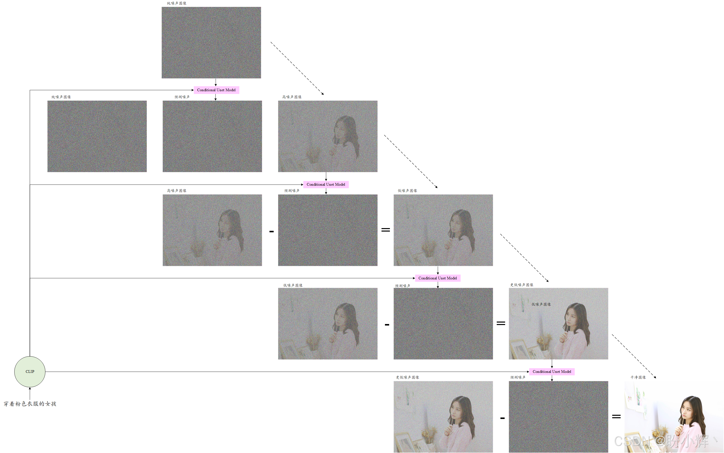 训练好条件UNet模型后,图像生成的剩余流程与DDPM 过程相同。唯一区别在于:我们使用的是条件 UNet 而非普通 UNet,如下图所示,在每个时间步迭代时,我们同时将文本和图像作为输入传入模型。