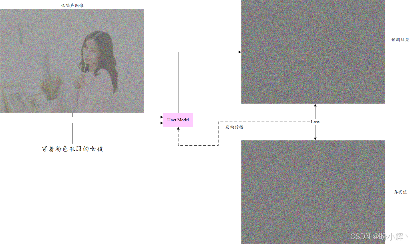 在扩散模型的 UNet 模型训练流程中,我们仅训练模型从含噪图像中预测噪声。为实现文生图功能,需使用以下架构,将文本作为额外输入注入 UNet 模型: