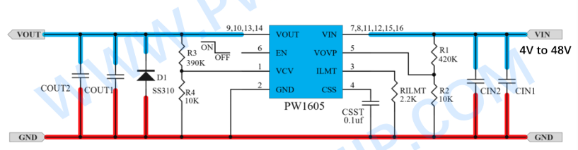 输出电压钳位:在输入电压正常但偏高时(例如24V系统可能承受28V的短时浪涌),PW1605可通过VCV引脚外接电阻(R3, R4)设定一个安全的输出电压上限(VCLAMP = 1.2V × (R3/R4 + 1))。当输入电压高于VCLAMP但低于VOVP时,输出被稳定钳位在VCLAMP,为后级低压电路提供一道安全屏障。